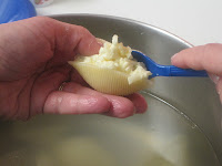 - Boil for 5 minutes. Do not drain. Add cold water to the pot of shells, draining small amounts of water and adding additional cold water until the water is just warm to the touch. The shells should be covered with water and not be completely cooked through.