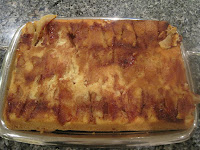 - Place the slices on top of the cinnamon and sugar in the pan in 3 long rows of overlapping slices.