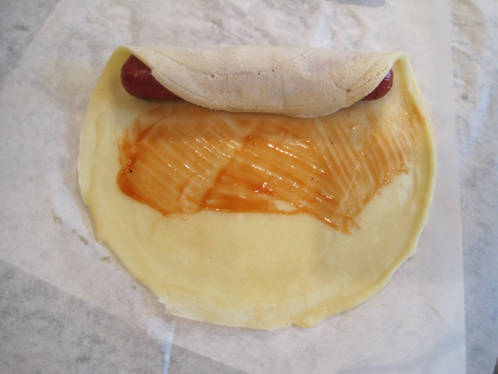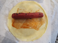 - Roll the blintz wrapper around the hot dog pressing to seal.