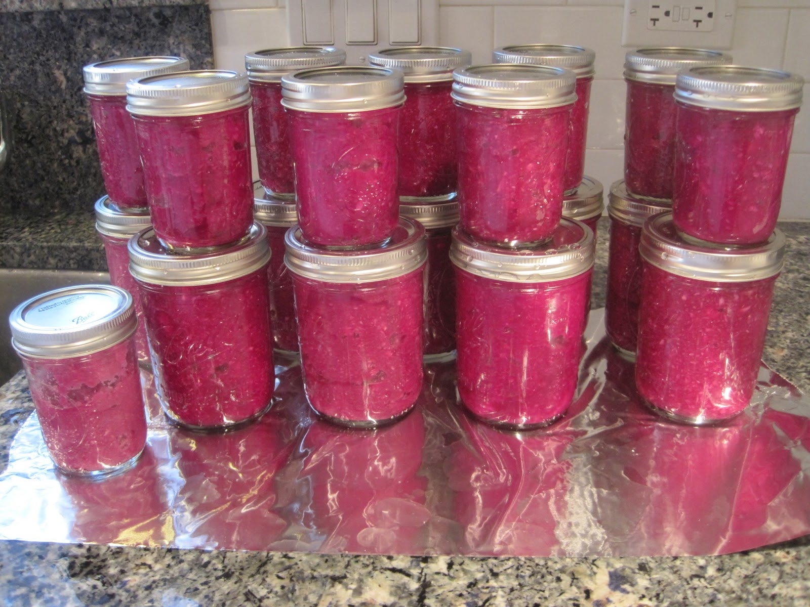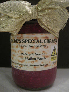 This year I went out and bought my own “Sun Tea” pitcher and put up russel before Purim. I too went in search of “dirty” horseradish and ended up with nine roots – I kept finding ones that were dirtier than the ones I had already bought! I bought a few glass vases at the dollar store and lined up the horseradish roots just like Dad did. This past week I once again pulled out my blender, my gorgeous russel, and my son’s safety goggles, and proceeded to make Zaide’s Chrayn. Let me tell you, nine horseradish roots make a lot of chrayn!!! Wanting to give hakoras hatov to some of our very special friends who have been incredibly kind, supportive, and loving this past year, I bought some Mason canning jars to fill with some of the chrayn that I was making to give as Pesach gifts to these special friends. In the end I had nineteen jars!!! Dear Husband and Dear Niece (who is vising from NY – HOORAY!) helped to add a finishing touch of some special labels and Zaide’s Special Chrayn was complete. The labels even had a “Caution HOT” emblem on them – no one can say they weren’t warned.